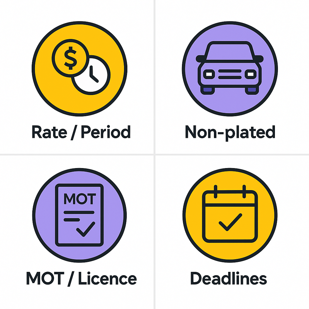 A lapsed MOT or licensing admin slip invites scrutiny. Fix it immediately, keep receipts, and be ready for questions about hire necessity and duration.